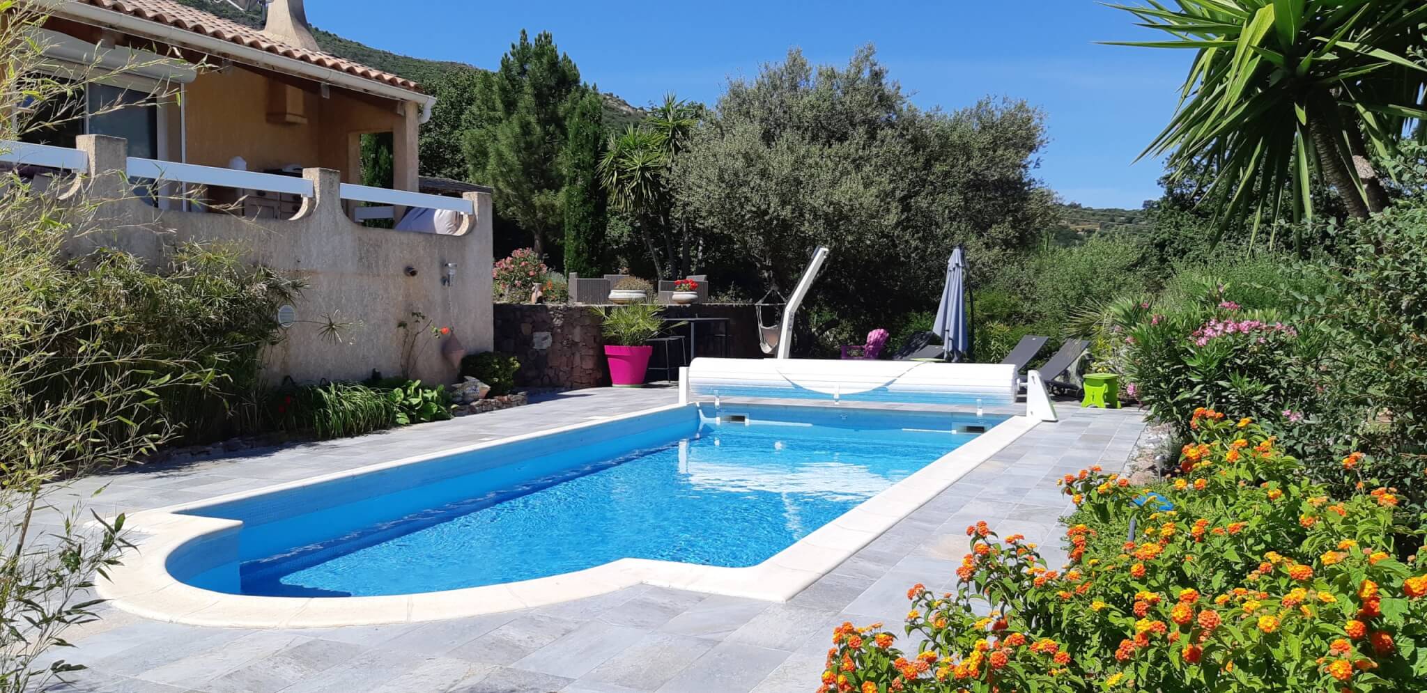 - Terrasse piscine en bois avec solarium et transats, douche solaire.